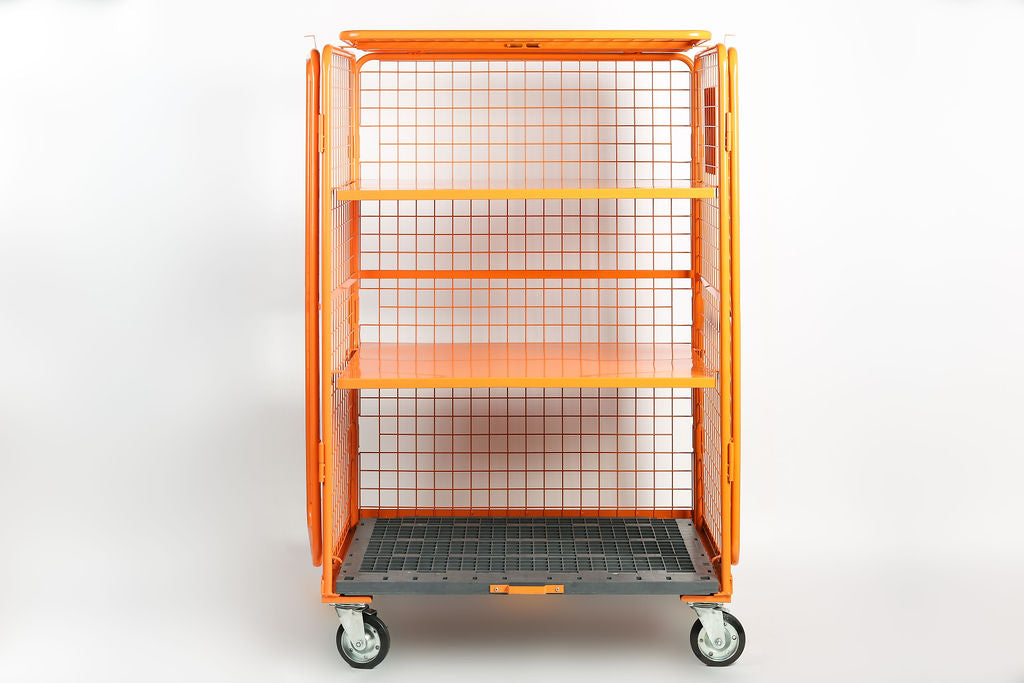 The trolley cage is a foldable site cage and comes with 4 wheels (2 locking wheels) and 500 kg capacity, folds down fully flat or stacks into a L shape for storage to minimise space required to store and can be locked to store tools securely. Available for sale today as a stand alone cage or with the addition of shelves.
